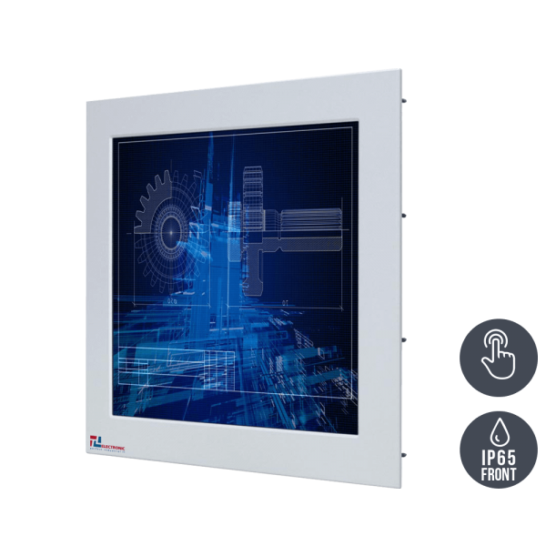 Industrial LCD for professional use Industrial monitor in sturdy sheet steel design Robust aluminum front panel (IP65-protected) Designed for industrial applications in continuous operation Panelmount installation with rear screwed bolts Long-term availability. 17” (4:3) active matrix TFT built-in LCD with aluminum front frame panel mount, “Type PMA”, color RAL7035, with fixing bolts and rear sealing lip. Protection class: front IP65 Version: covered at the rear to prevent accidental contact (cage chassis) LCD dimensions: 410 x 330 x 58 mm, front panel dimensions: 483 x 399 x 5 mm, Resolution: 1280 x 1024 pixels Video input: 15 pin HD sub socket (VGA) + DVI + HDMI Supply voltage: 12 V/DC, incl. external power supply unit with 100-240 V/AC Temperature range: 0-50° C (operation), -10-60° C (storage) incl. resistive PREMIER touchscreen, USB Origin: Taiwan